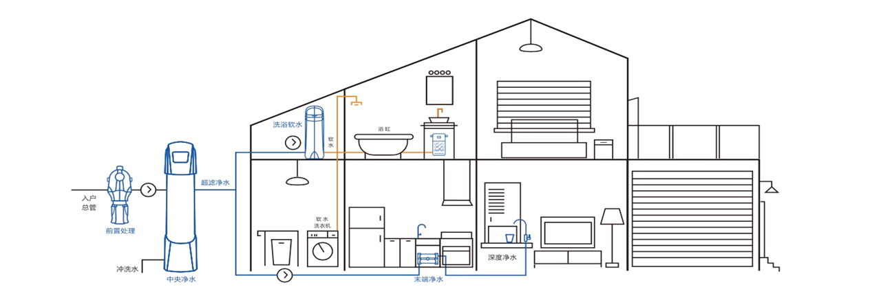 全屋凈水系統(tǒng)是從水源入戶開始,根據(jù)家庭不同用水點(diǎn)需求,通過不同凈水產(chǎn)品科學(xué)合理搭配,將家庭飲水、廚房用水、洗漱、沐浴及洗衣等生活飲用水進(jìn)行全方位深度凈化,以全面深度保護(hù)家人身體健康及熱水器、洗衣機(jī)、浴缸、淋浴器、智能馬桶等家用涉水設(shè)備。全屋凈水系統(tǒng)一般由前置處理產(chǎn)品、中央凈水產(chǎn)品、軟水產(chǎn)品、末端凈水產(chǎn)品組成。